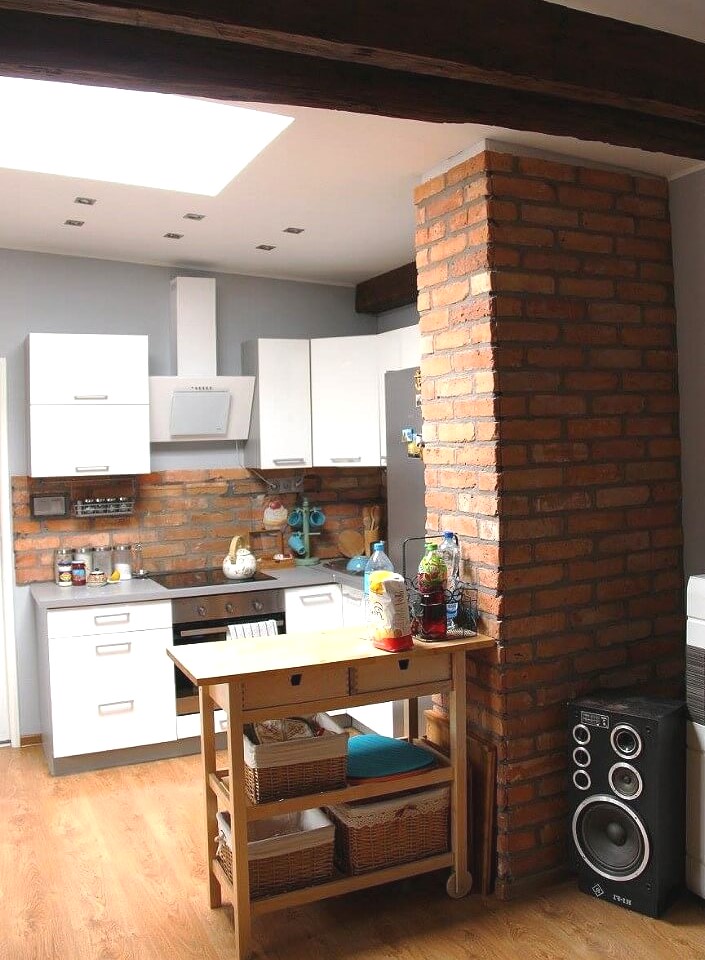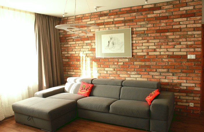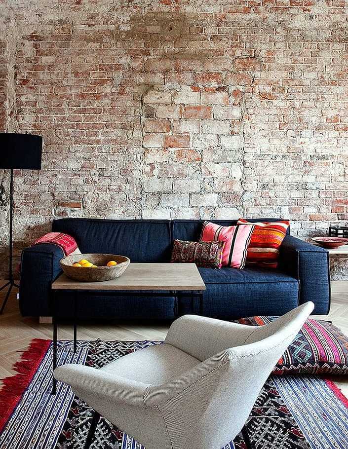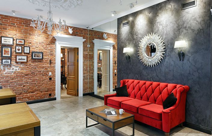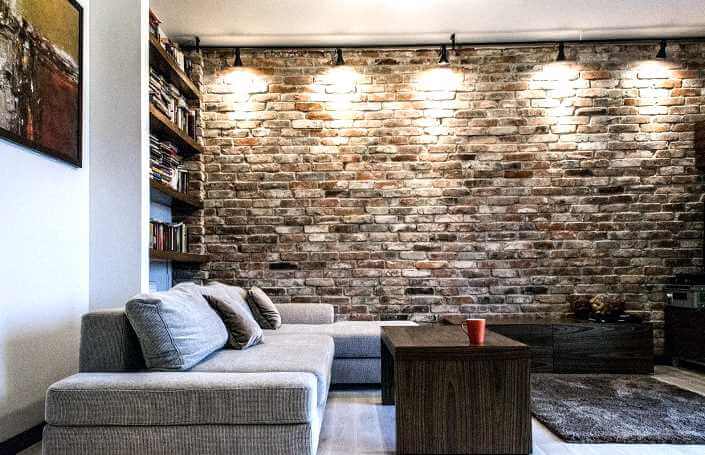 Вам нравится искусственный кирпич в интерьере? В старом здании он может прятаться за слоем штукатурки. Как вариант, возможно удаление штукатурки, очистка и пропитка кирпича. Лучше всего использовать для пропитки специальное масло. Благодаря ему легче содержать покрытие в чистоте. Однако такой вариант, по понятным причинам, доступен единицам. Так же он существенно ограничивает возможности общего дизайнерского решения.