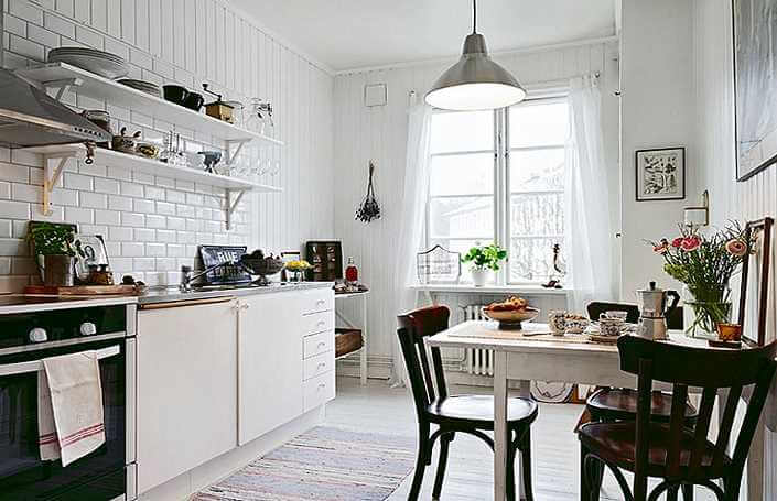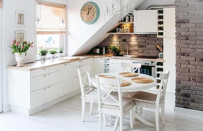 Белый кирпич в интерьере кухни на фото чистый и светлый. Но применение такого варианта требует дополнительной обработки материала и особого ухода