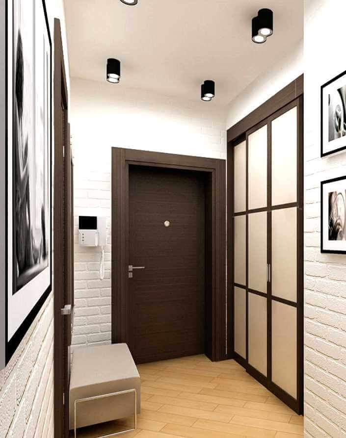 Белый декоративный кирпич в интерьере прихожей на фото отлично сочетается с грамотно подобранным цветом венге  дверей квартиры