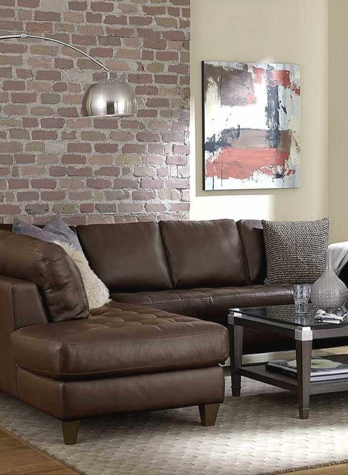 Вид старой кладки красного кирпича идеально сочетается с тёмным деревом и кожаной мебелью в тон