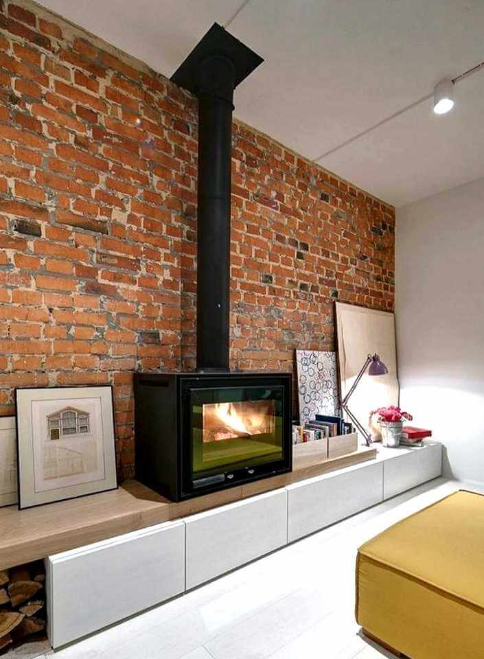 Красный кирпич в гостиной в сочетании с камином просто беспроигрышный вариант