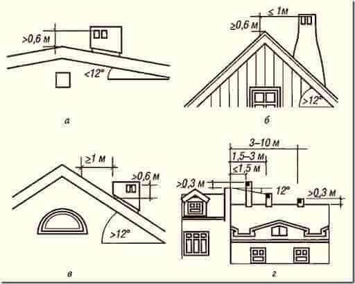 Минимальные расстояния оголовка канала естественной вентиляции от конструкций дома. а — на плоской крыше с уклоном менее 12 град.; б — на скатной крыше при расположении оголовка ближе 1 м. от конька; в — то же, но при расположении оголовка далее 1 м. от конька крыши; г — расположение оголовка вблизи вертикальных поверхностей (преграды для ветра). |