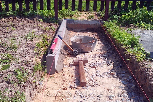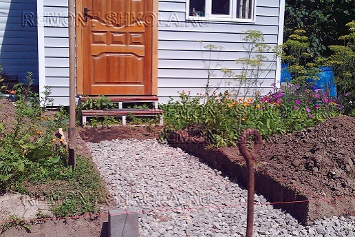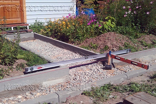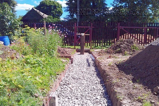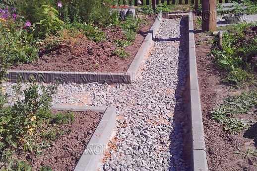 Равномерно распределив щебень по всей поверхности ложа приусадебной дорожки, производим в обязательном порядке его трамбовку. Контролируем уровень щебня, измеряя расстояние от него до бечёвки. Оно должно равняться высоте бордюрного камня.