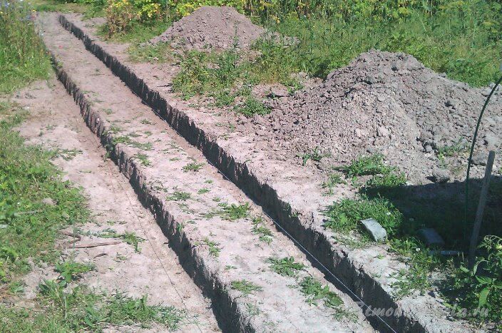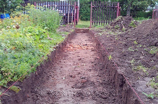 Отличие от классического способа заключается в том, что первоначально вынимается не весь грунт, а только грунт с линий укладки бордюров (ширина штыка совковой лопаты).