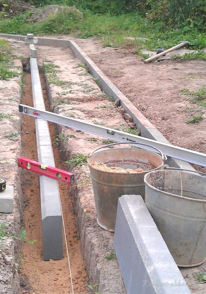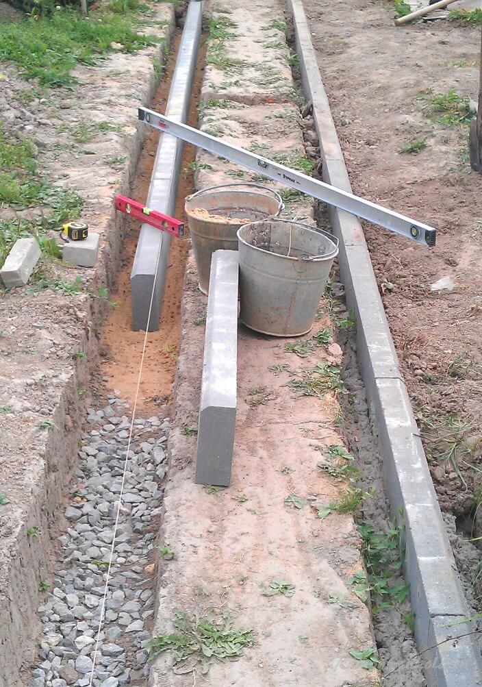 После выемки грунта идёт установка бордюров. Всё также: по уровням и по расстояниям.