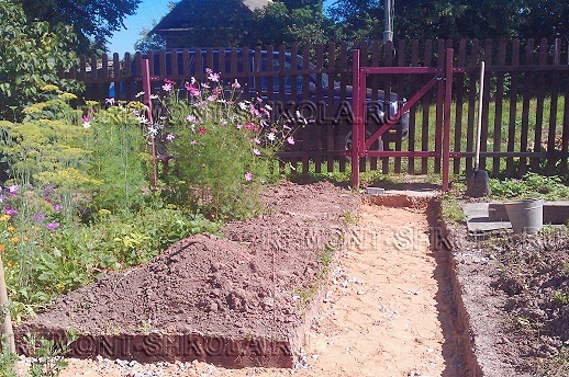 По окончанию установки бордюров из центра дорожки снимаем слой земли по минимуму (сколько — смотри дополнительную информацию выше). Этой землёй обсыпаем бордюры, а её остаток планируем.  Далее действуем по инструкции.