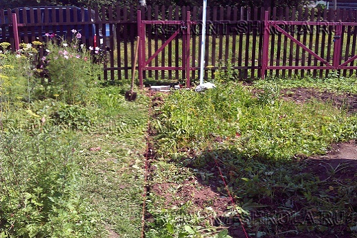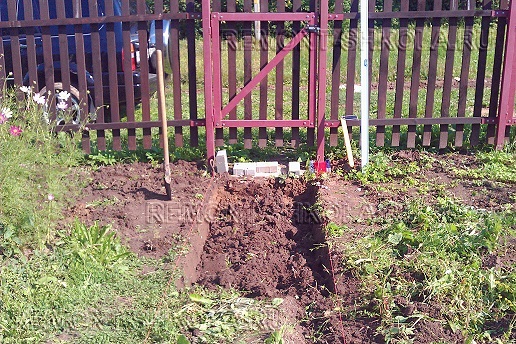 После очистки территории дорожки и разбивки её координат на местности приступаем к удалению грунта. Первый вопрос: как глубоко копать? Расстояние между плоскостью дорожки (натянутая бечёвка) и нижним уровнем удаляемого грунта состоит из: несущего слоя (щебня) — около 15 см, выравнивающего слоя (песка) — 3-5 см, и самой плитки.