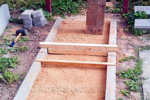 При сооружении несущего слоя обязательно уделите внимание качественной трамбовке, послойной просыпке песка и качественной проливке песка.