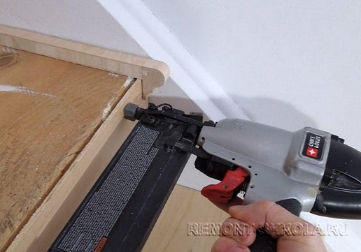 Производим крепление верхней накладки с помощью пневмопистолета. Крепление производится в месте её прилегания к боковой части ступени. Эта часть перекроется торцом боковой накладки и в результате места крепления будут незаметны.