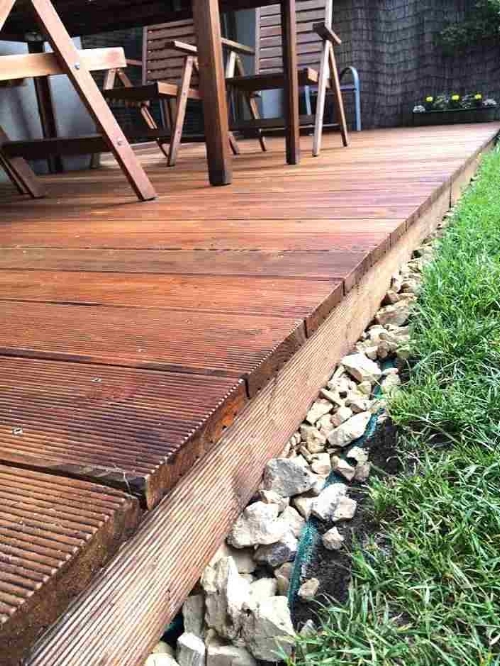 Нет ничего хуже, чем видеть проросшую через зазоры террасной доски траву, а её удаление в дальнейшем, безусловно,  дело хлопотное. Именно поэтому рекомендую использовать нетканый геотекстиль, произведенный иглопробивным способом, который так и называют иглопробивной (он дешевле). Конечно можно использовать и другой полимерный материал, который не даст возможности роста сорнякам под вашей террасой. Если у вас есть старый линолеум, то можно использовать и его.
