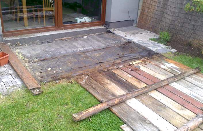 Покрытие основания террасы нетканым геотекстилем устранит дальнейшие проблемы с сорняками.