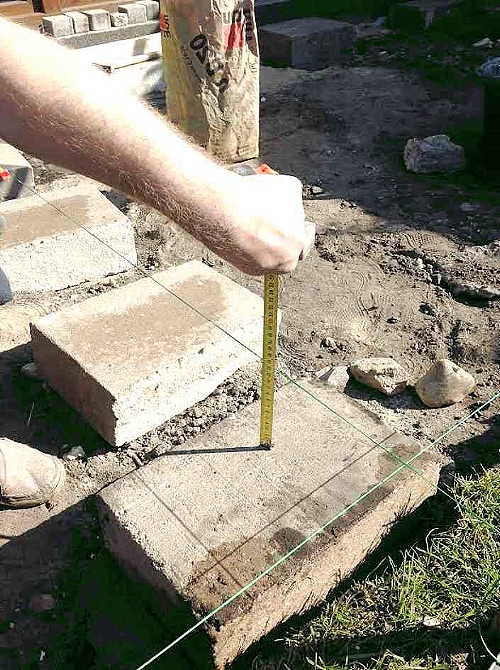 Продолжаем устанавливать и все другие блоки, контролируя уровнем плоскость их установки и метром их положение относительно контрольной линии (шпагат).