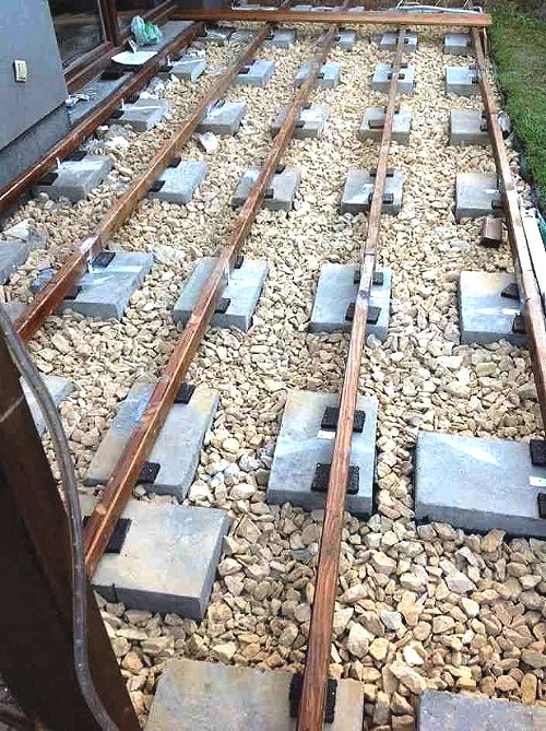 Общий вид: лаги закреплённые на фундаментных блоках. Можно начинать укладку покрытия.