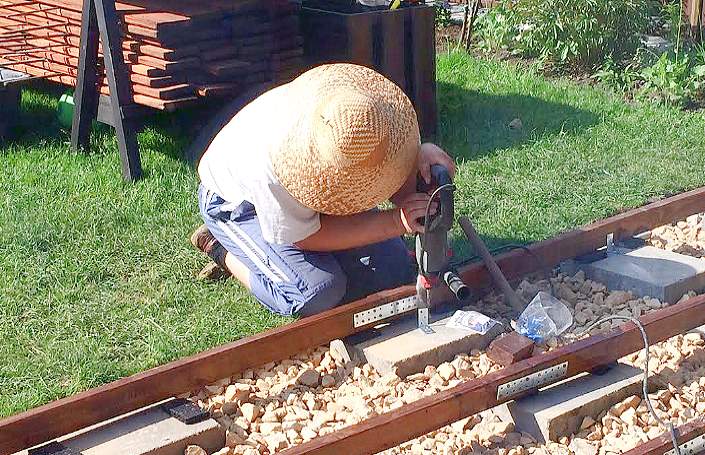 Измерение уровня установки фундаментных блоков для деревянной террасы.