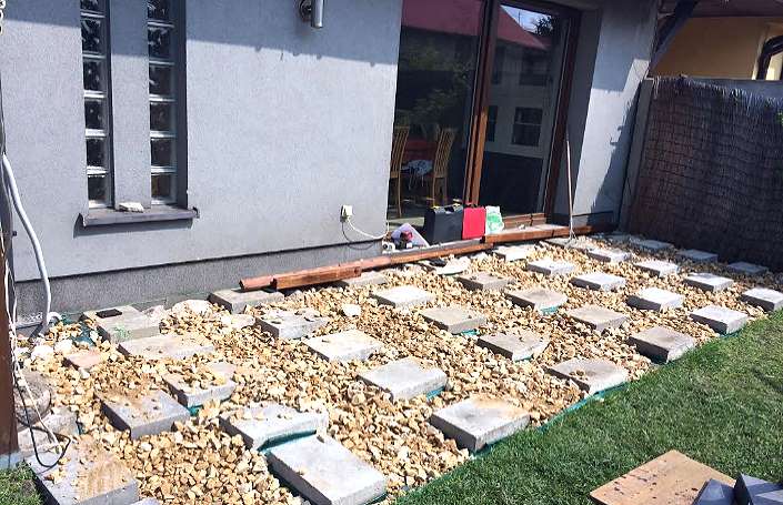 Если вы делаете террасу  на ровном уже готовом основании, например это может быть бетонная плита, плитка или  брусчатка, то вопросов нет: просто проложите резиновые прокладки и укладывайте лаги. Но если вы делаете террасу непосредственно на грунте, то всё «немного» усложняется. И это наш случай. И так, как сделать фундамент террасы?