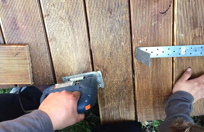 После окончательного крепления доски на всей площади террасы отрежьте  выступающую часть доски электролобзиком, предварительно прочертив ровную линию отреза.